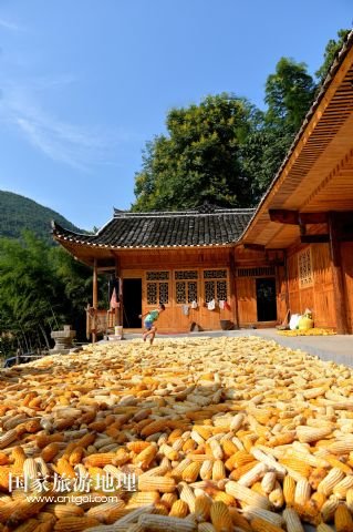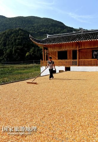 國(guó)家旅游地理 湖北恩施8月22日訊 8月22日,湖北省宣恩縣水田壩村二組農(nóng)民侯慶云在吊腳樓前晾曬玉米。初秋時(shí)節(jié),湖北省恩施土家族苗族自治州宣恩縣農(nóng)民搶抓時(shí)節(jié),對(duì)玉米等農(nóng)作物進(jìn)行收獲晾曬,山鄉(xiāng)家家戶戶忙“曬秋”,到處是一派豐收景象。 /新華社發(fā)(宋文 攝)