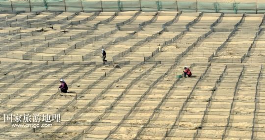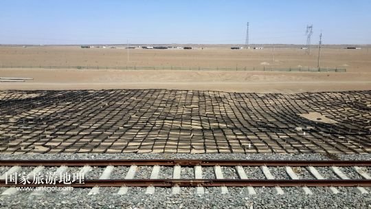 國家旅游地理 內蒙古阿拉善4月21日訊 錯落布局在內蒙古臨策鐵路(臨河——策克)旁的網(wǎng)格沙障(4月18日攝)。穿越我國北疆內蒙古阿拉善高原大漠的呼和浩特鐵路局臨策鐵路沿線有400多公里“無人區(qū)”,這里常年干旱少雨、風沙肆虐、植被稀少、人跡罕至,30多萬平方公里的荒漠、戈壁縱橫交錯,自然條件極度惡劣。