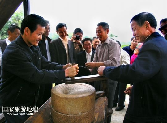 4月28日,游客在江西省靖安縣雙溪鎮(zhèn)大橋村體驗(yàn)農(nóng)家推石磨。
