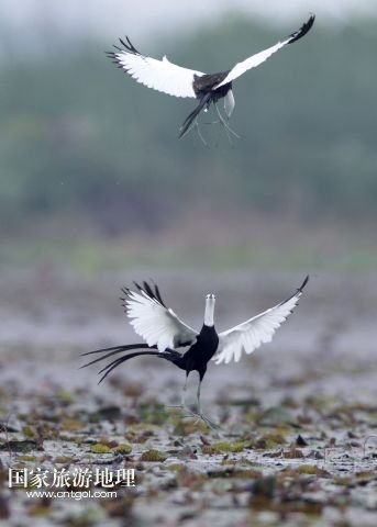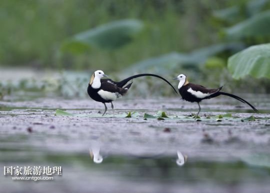 國(guó)家旅游地理 江西九江5月31日訊 5月29日,兩只水雉在江西省九江市賽城湖濕地嬉戲。入夏以來,數(shù)十只漂亮的水雉飛抵江西九江市賽城湖濕地,湖區(qū)良好的生態(tài)為水雉提供了舒適的棲息環(huán)境。水雉體態(tài)優(yōu)美,羽色艷麗,輕步行走于睡蓮、荷葉等浮葉植物上,有“凌波仙子”的美名。/新華社發(fā)(沈俊峰 攝)