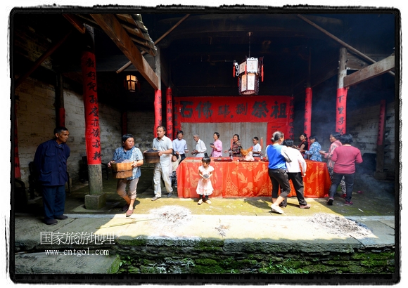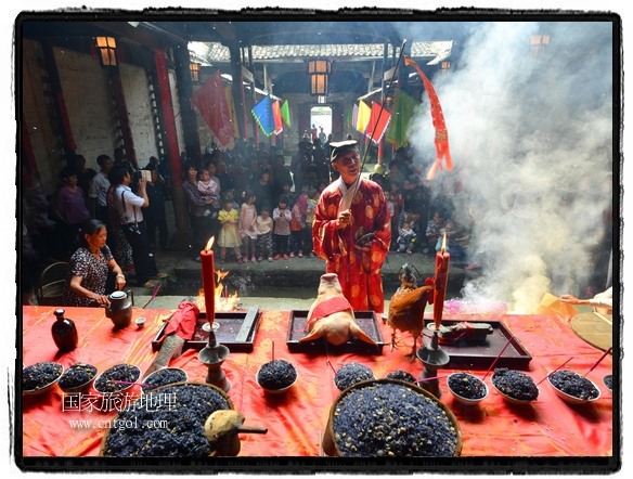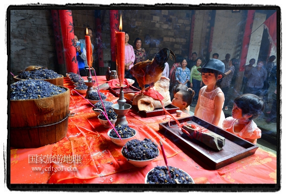 國(guó)家旅游地理 江西婺源(上饒)5月31日訊(特約記者王國(guó)紅 通訊員程新德攝影報(bào)道) “祭祀開(kāi)始、鳴炮奏樂(lè)、祭拜、主持人講話、結(jié)束鳴炮”,5月25日,農(nóng)歷四月初八,石佛村烏飯節(jié),村民將自家精心制作的烏飯端進(jìn)祠堂祭祀。江西省婺源縣段莘鄉(xiāng)石佛村每年都要舉行烏飯祭祖活動(dòng),各家各戶(hù)將自家精心制作的烏飯端進(jìn)祠堂……